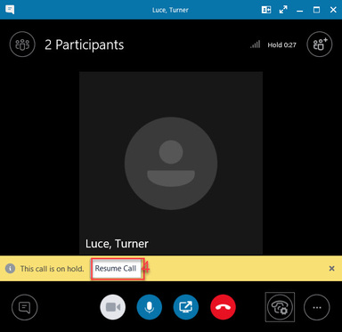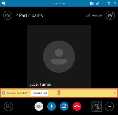 3. The call will be placed on hold and a yellow banner will appear in your call window indicating the call is on hold. The caller placed on hold will hear "Music on Hold"; if they on Skype for Business they will also see a yellow banner indicating the call is on hold.